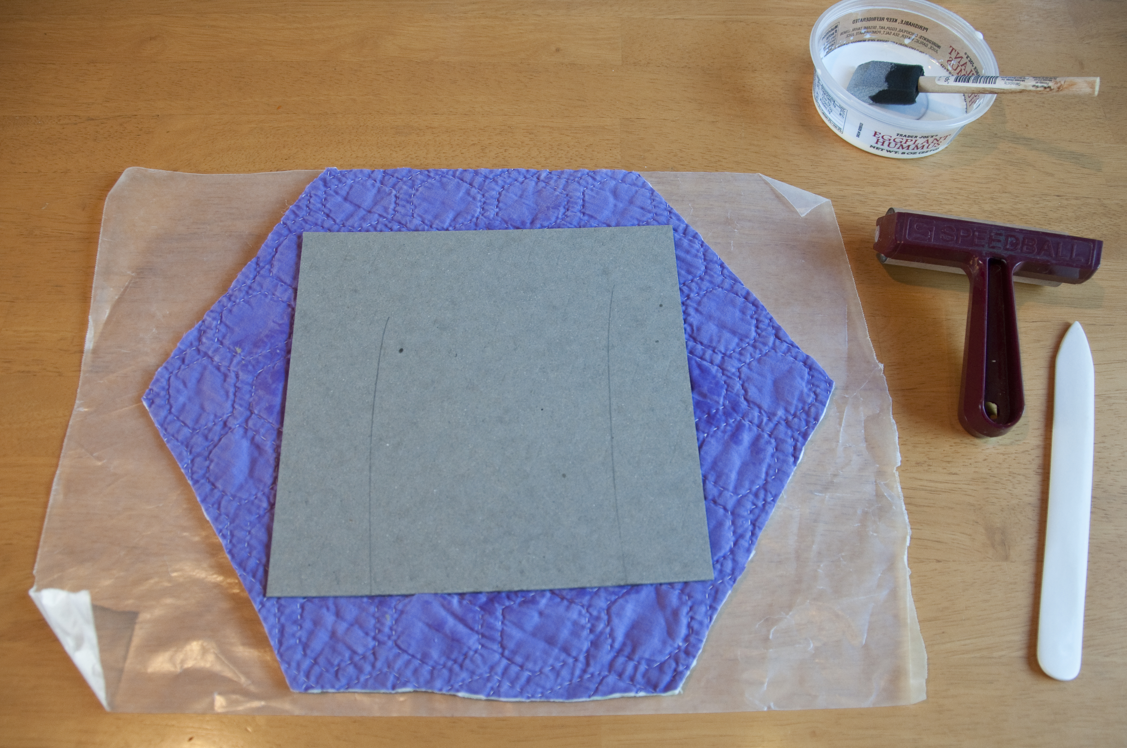 1. I applied glue to the Davey board and then applied it to the quilt. The lines on the Davey board are the grain direction. The quilt is an odd shape because it follows the quilt pattern. I decided that rather than cutting it down further I would try to use it in this shape. I used a brayer after every step in gluing so as to get the best possible contact between the fabric and the board.