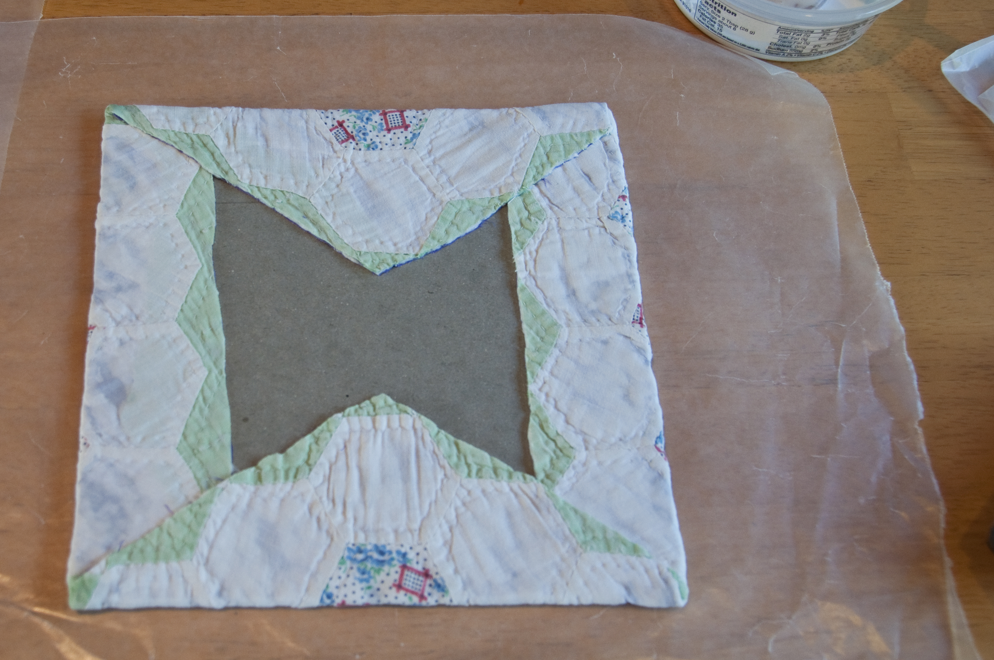 6. The front piece of the quilt glued onto the Davey board. I decided in order to get even pull front and back that I had to use another piece of the quilt as the back side. I used the pieces that are in lesser shape as backing pieces. I wish now I’d kept all of the edging (which would have been large enough to use here). Note to self: keep all of the pieces until the project is done!