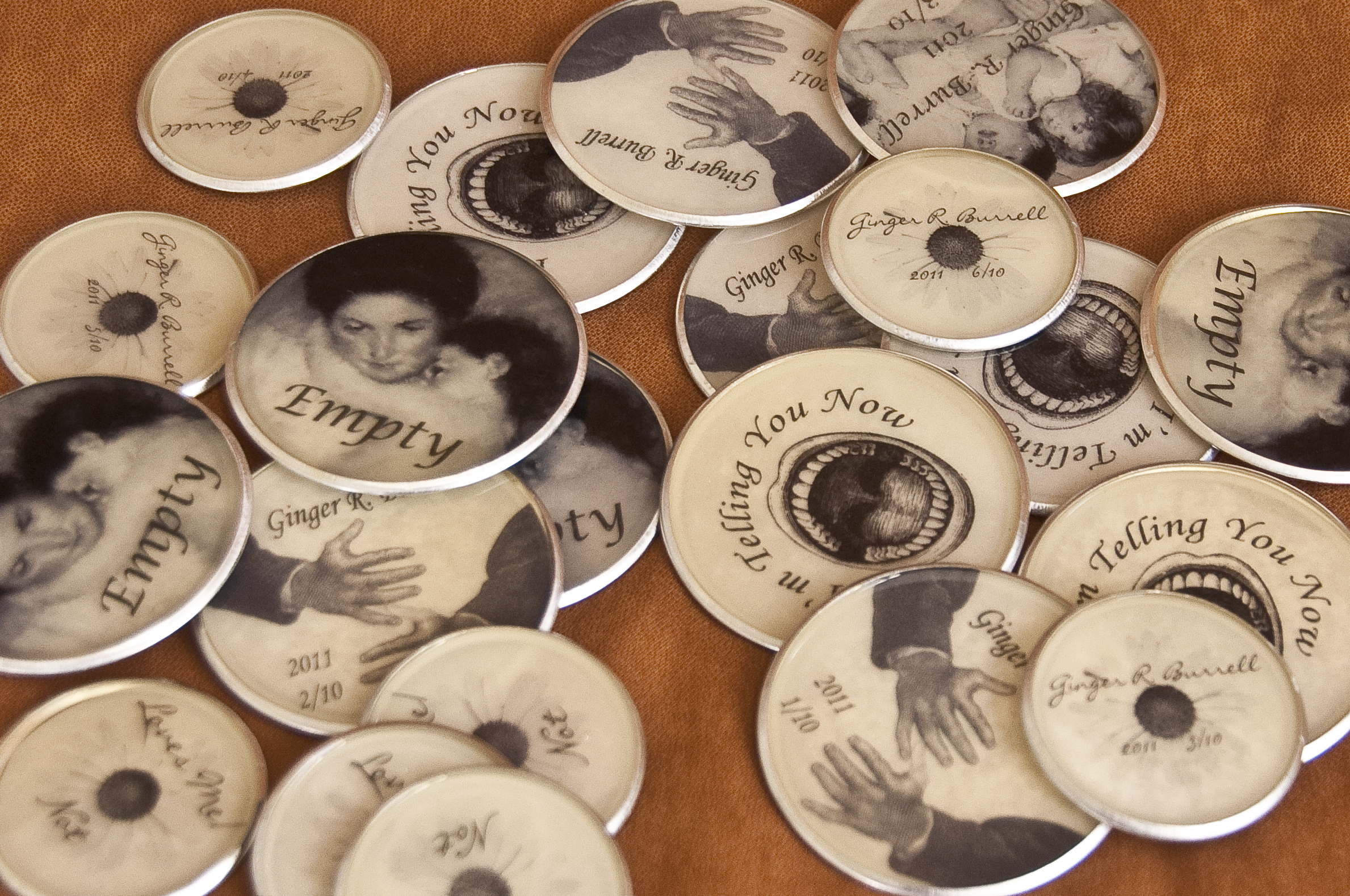 For the past several weeks I’ve been working on the labels in the above photo. It’s a technique using coarse embossing powder to create a translucent shell over an image. In the past I’ve used it to make a translucent disk and, at the beginning of this project, I tried to do that same process. I had all kinds of technical problems, finding a frame large enough (in the past I’d used metal washers), warping during melting, warping during cooling and, once I thought I’d solved those problems, I’d find out my sample pieces were the flukes and I really hadn’t solved the problems at all! To compound the issue, when I attached them to book covers, I realized I didn’t want them translucent after all – the adhesive (and any bubbles) showed right through.