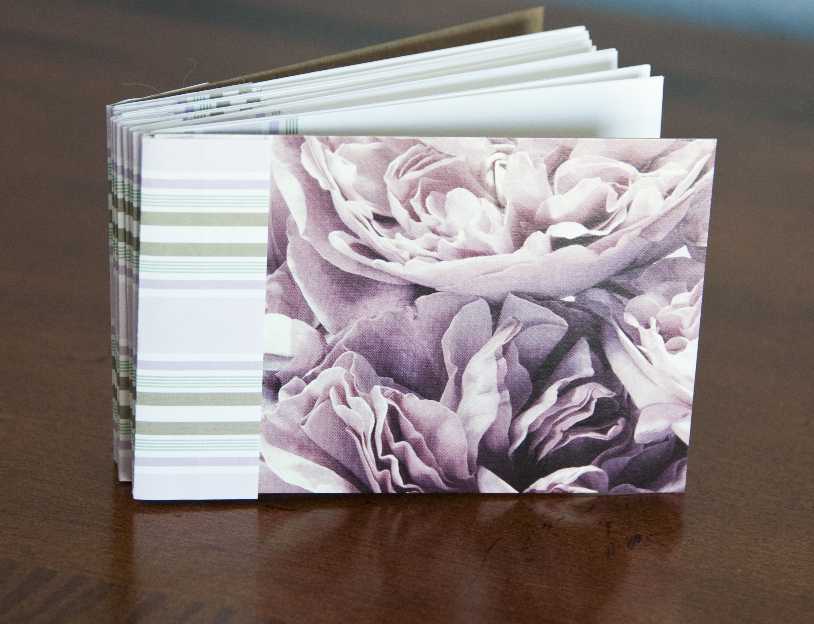The finished book is multi-layered with poetry printed on cotton patterned fabric, pages made of layered pattern paper, and pages of the original book. The altered/artist book is sewn both by hand, with Coptic binding, and also by machine, through the cotton and paper pages.