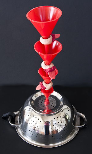 Original drawing; single-plate, hand-carved, Speedball E-Z Cut block; Speedball Water Soluble Block Printing Ink, Rives BFK paper; brayer, paint brush (dabbed red); Line-o-Scribe letterpress