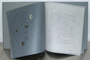 I don’t know her personally, but one of her books, A Week of Jewels, has really stayed with me since I first met her last year at Codex. A Week of Jewels, using Ms. Silverberg’s own words, is “a book about a minor event, a missing ring, that signifies loss.” Perhaps because a dear friend of mine is dealing with his mother’s dementia, and perhaps because we all worry about our parent’s forgetfulness, this book is poignant and universal. It is also beautifully made using Ms. Silverberg’s own handmade paper. (She runs a papermaking studio, Dobbin Mill.)