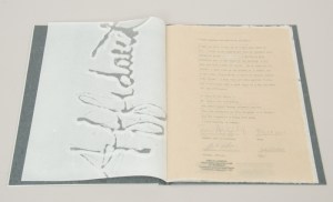 At the CBAA conference this year, I enjoyed a new-to-me work, Affadavit. Says Ms. Silverberg, “Istán Örkény’s story of the same name, from his collections of “One Minute Stories,” was the fillip for this small edition. This artist book about a ‘day in the life…’ of an artist spans segments of a day as seven statements of identity. Despite that each one ends with a declaration of forgery and fraud, Silverberg had them notarized by different notary officers. The process spurred discussions or even conflicts with the notary officers about identity. Each interaction was logged and described in the “Compendium to Affidavit”.