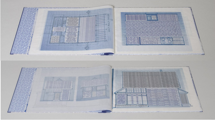Also at Codex, I found Home Sweet Home to be interesting and thought-provoking. From Ms. Silverberg’s website, “For this book about the home, I “designed” an architectural album of an imaginary middle-class suburban house, filling its plans and layout with the many proverbs I’ve found about woman in the home. The book was printed to look like the almost obsolete Diazo printing (blue-printing), but in fact, is archival inkjet. The proverbs depict a prevailing misogyny that is as funny as it is painful.”