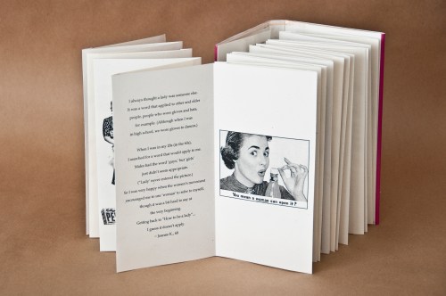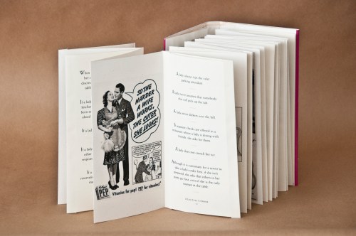 I am fascinated with technology and enjoy incorporating the digital with the traditional book form in a way that serves the book’s content. In the one copy for Marin MOCA, Paper Dolls features a digital frame which plays a fashion show of pattern packets with women’s clothing from 1900 to the 1970s. This theme is further expressed with inclusion of cut-out paper dolls presented in the “sewing” box with the finished book.