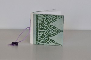 The second book, Lace Journal, was made by debossing the lace pattern into the clay using a pasta press and then emphasizing the pattern with fluid chalks. The polymer clay panels are then glued onto a pamphlet stitched book made of Rives BFK.
