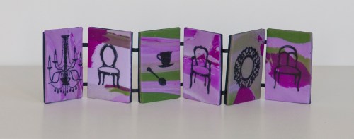 The last book, Tea at Grandmother’s,  is made entirely of polymer clay panels. After marbling two colors of purple with some green clay, I cut out 6 panels and baked them. I stamped the black images onto the clay using Staz-On ink and baked the panels again. To make the images part of the panels I painted them with liquid clay, which turned translucent after a third baking. Finally, I cut black panels the same size as the original marbled panels and embedded, between the sets of panels, two black ribbons the length of the book. The black ribbon acts as hinges for the finished accordion and went through the final baking process just fine.