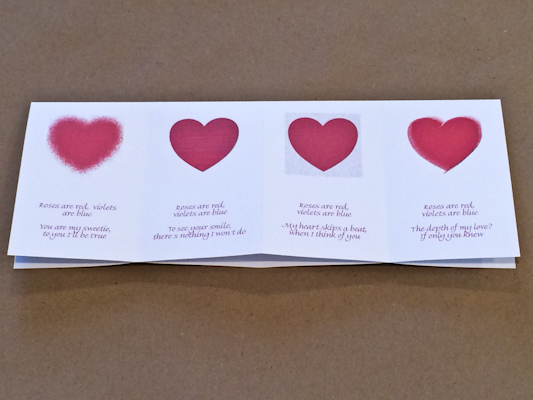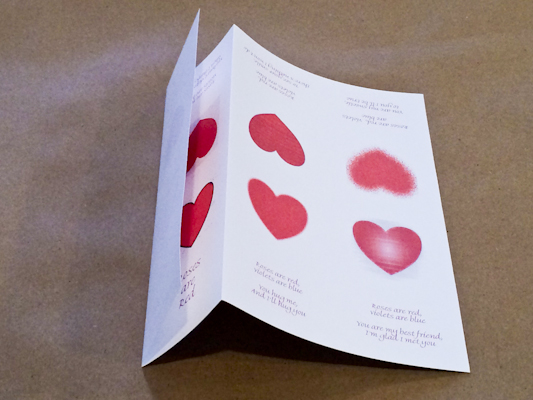 To create the graphics for this book, I took a basic red heart and used Adobe Illustrator filters on it. This simple technique creates both the variation and the similarity that hold the book together. In a nod to the Valentines of our youth, the text is an assortment of “Roses are Red” sayings that were collected from around the web. The heart on the last page is white in the middle so that you can write in a message of your choice. (Feel free to add glitter…)